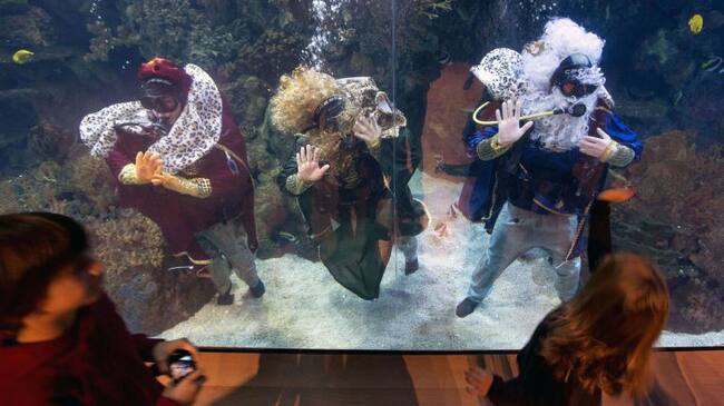 Los Reyes Mayos saludan a los niños, mientras bucean entre especies marinas, en el Oceanográfic de la Ciudad de las Ciencias en Valencia. / MANUEL BRUQUE (EFE)