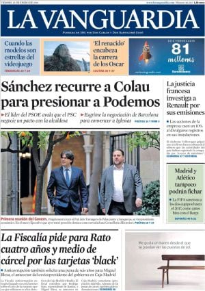 A la vista del titular de La Razón, no ha sentado bien en Mocloa el préstamo: "Sánchez entrega sus escaños a los independentistas y cuestiona al Rey". En un editorial, ABC considera que el PSOE corre en auxilio de los separatistas y El Mundo lo califica de grave error. A excepción de la reforma de la Constitución esbozada por el ministro García Margallo, "Rajoy no tiene previstas gestiones inmediatas para formar ejecutivo", nos aclara El País. Por cierto, Pepa, que el director de La Vanguardia, Marius Càrol cuenta una jugosa anécdota en la relación con el ministro de Asuntos Exteriores en funciones. En principio debía ser él quien presidiese la sesión constituyente de la undécima legislatura como diputado de mayor edad, pero fue María- Teresa Lara. La diputada madrileña confesó un pecado de coquetería: nació en el 42 y no en el 44 como había figurado en su ficha parlamentaria en las anteriores cinco legislaturas y, por tanto, era unos meses mayor que Margallo.