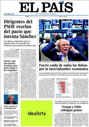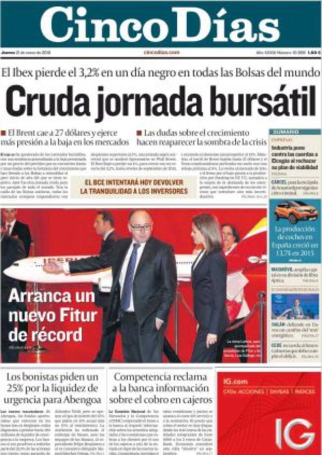 Con esa "cruda jornada bursátil", como la califica Cinco Días y que El País, en un editorial atribuye al `crash´ del petróleo, un efecto secundario de los temores sobre la economía china. A la que se podría añadir, si hacemos caso a Le Monde, a Rusia: la economía rusa se prepara para el peor de los escenarios arrastrada también por la el descenso del precio del petróleo.