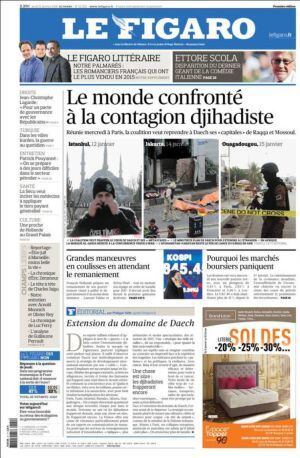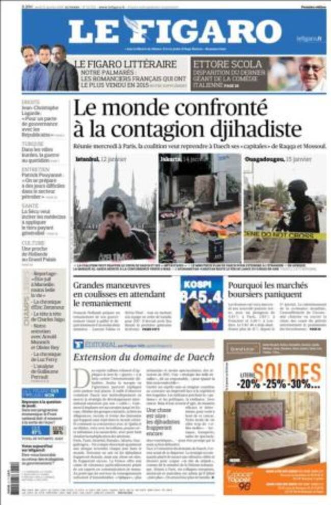 Tras la reunión de ayer en París de los países que conforman la coalición que les combate en Siria e Irak, Le Figaro titula: "el mundo se enfrenta al contagio yihadista" sobre la foto de los atentados de Estambul, Yakarta y Ouagadougou que han marcado este mes de enero. El yihadismo ha causado un millar de muertos en 70 atentados en los tres últimos meses. LLuis Bassets estima en El País que "la primera victoria del ISIS es durar, pero la segunda es su capacidad expansiva global". Incluido en Europa, donde, a su juicio, y a falta de pruebas fehacientes, es bastante verosímil que en la noche de Año Nuevo se produjera una coordinación en los ataques sexuales a mujeres en 12 ciudades de cinco países. "Este tipo de comportamientos sólo pueden satisfacer a los cerebros del Daech".