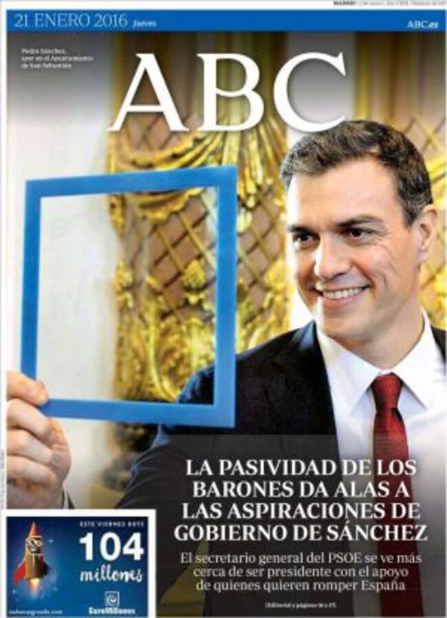 No muy bien, la verdad. ABC editorializa sobre "la peligrosa tentación del poder" en alusión a Sánchez y su subdirector, Luis Ventoso, llega a considerar en su columna que "un gobierno de Sánchez, legal pero ilegítimo, sembrará una gangrena social". Así que La Razón y El Mundo destacan una información que anoche adelantó en exclusiva la televisión Antena 3, en la que se consigue el reto periodístico de agrupar en el mismo titular al presidente de Venezuela, la CUP, Podemos y ETA: "Maduro reunió a la CUP, Podemos y al suegro del jefe de ETA", en referencia a un viaje pagado por Caracas para un foro de apoyo a la autodeterminación en el que participaron Anna Gabriel, el suegro de David Pla, supuesto número uno de ETA, y la dirigente de Podemos en Castilla-La Mancha, María José Aguilar.