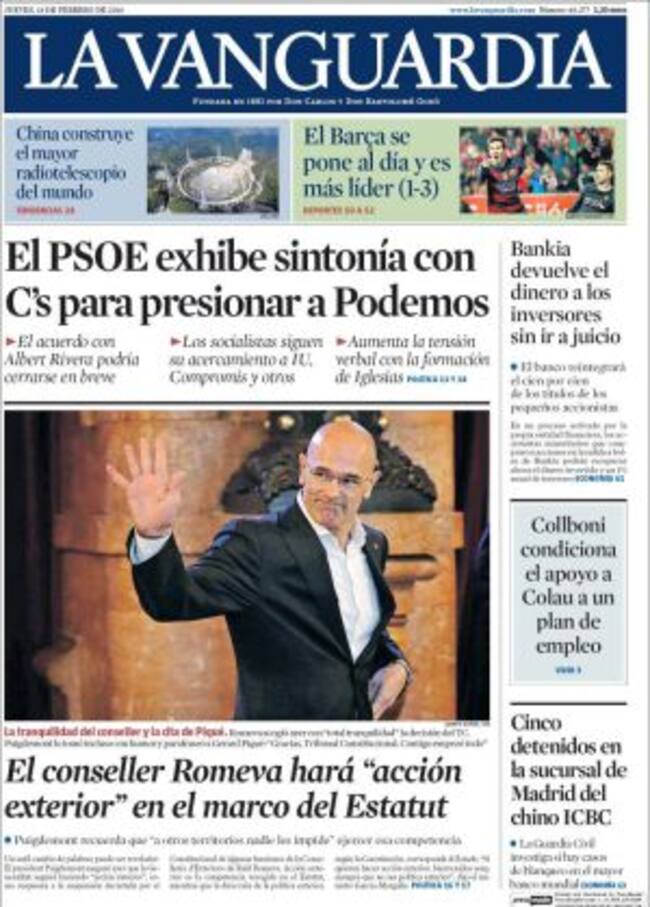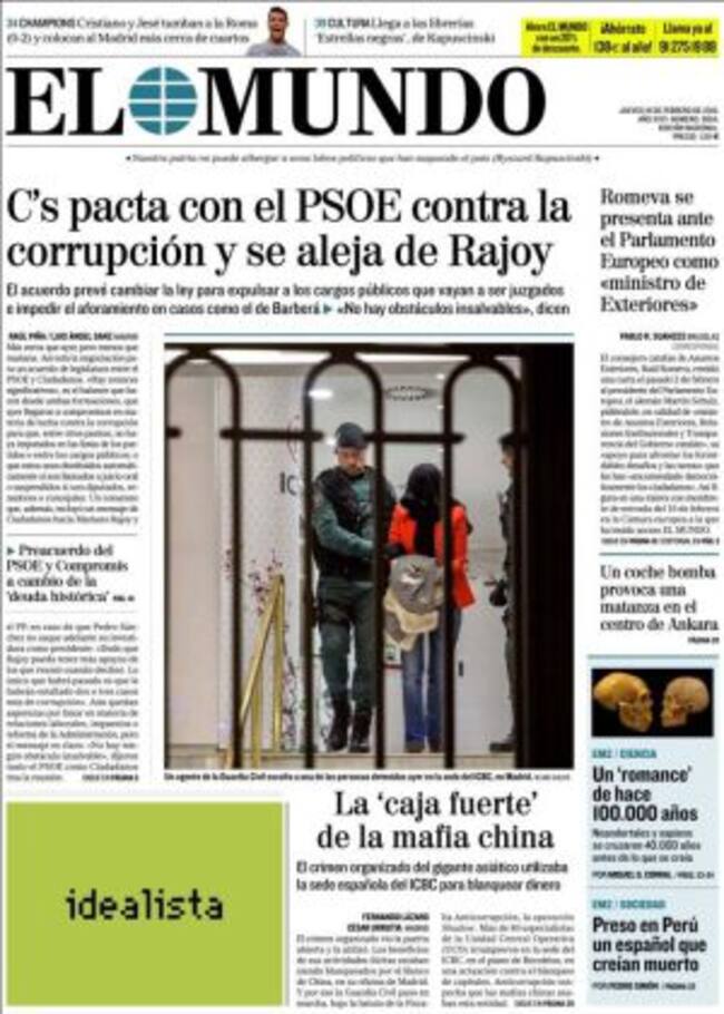 En corrupción, por ejemplo. Y "se aleja de Rajoy" a juicio de El Mundo porque el acuerdo "prevé cambiar la ley para expulsar a los cargos públicos que vayan a ser juzgados e impedir el aforamiento en casos como el de Barberá". Y otros. El País insiste esta mañana en que el juez Eloy Velasco "sospecha que el Canal de Isabel II sirvió para alimentar la caja b" de los populares madrileños. El lunes preguntó a un adjudicatario: "¿Financió usted irregularmente al PP de Madrid?".