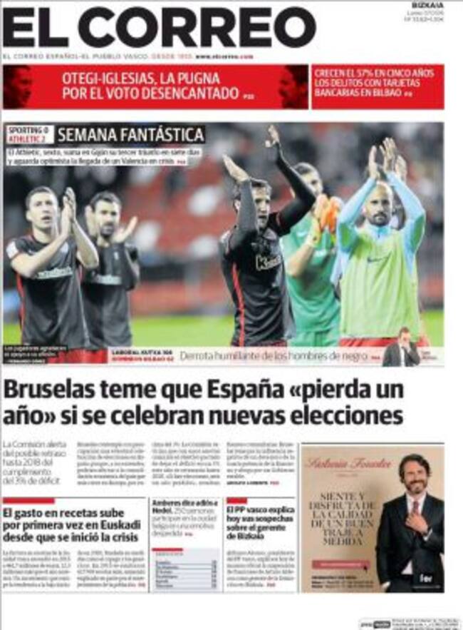 "Bruselas teme que España "pierda un año" si se celebran nuevas elecciones", asegura El Correo citando fuentes comunitarias, alertadas, como la Comisión, que la reducción del 3% se retrase hasta 2018. También se retrasan los viajes previstos a Japón, Puerto Rico y Portugal por el Rey Felipe VI, quien, leemos en La Razón, "tiene un 60% menos de actos desde el 20D". Este estado de orfandad que comienza a percibirse, estima Ignacio Camacho en ABC, da cuenta de que España es un país sobregonernado, acostumbrado a la subordinación civil... Una sociedad inmadura, en suma".