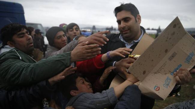 Inmigrantes, que esperaan cruzar la frontera entre Grecia y Macedonia, pelean por comida en un campo provisional cerca de Idomeni / MARKO DJURICA (Reuters)