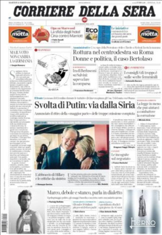 Tanto Il Correiere dela Sera como La Repubblica y La Stampa destacan los ataques de los que han sido objeto las candidatas a las alcaldías de Roma y Milán. La primera, de la derecha, ha sufrido la sugerencia de uno de sus rivales para que se dedique a su papel de madre. La segunda, del movimiento 5 Estrellas, ha retirado su candidatura después de haber sido insultada en las redes sociales por su aspecto físico. La ministra Boschi, uno de los rostros más populares del gobierno Renzi, mostró su apoyo a las candidatas denunciando el machismo político a través de tuiter.