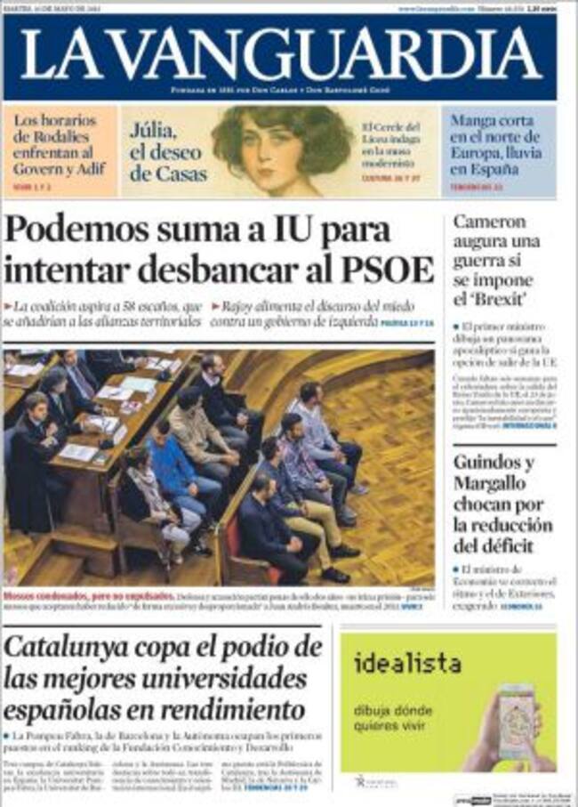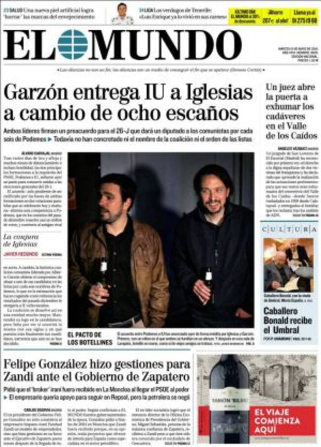Para empezar, la prensa conservadora no sabe cómo denominar el pacto entre Pablo Iglesias y Alberto Garzón. La Razón lo bautiza como "pacto de Sol" por el abrazo escenificado entre ambos dirigentes en el escenario del 15M a pocos días del aniversario. El Mundo se decanta por "el pacto de los botellines" por las dos cervezas que ambos compartieron en el acto conjunto que protagonizaron en Lavapies "cómo si de viejos amigos se tratase". No convence a este diario el compromiso que, a juicio de Javier Redondo, se debe a que "Garzón requiere una imperiosa financiación" para una organización que liquida por vía interpuesta. José Ignacio Torreblanca, en El País, va un poco más allá y considera que en Podemos se ha impuesto "la tesis de superar al PSOE por la izquierda en lugar de intentarlo desde abajo". Pablo Iglesias -argumenta- ha adoptado la táctica de Julio Anguita: arrinconar al PSOE, más que la defendida por Errejón e inspirada por el Pablo Iglesias original: sustituirlo de forma no traumática por un nuevo partido de masas. Es decir, ha ganado "Pablo Anguita" a "Íñigo Iglesias".