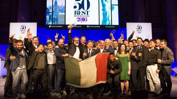 Algunos de los mejores cocineros del mundo, sobre el escenario de Cipriani Wall Street (Nueva York), donde se ha celebrado la gala 'Restaurant' de 2016. / 50 BEST