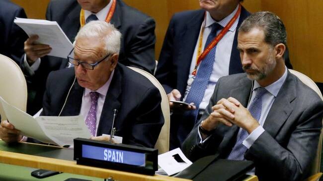 El Rey de España Felipe VI y el ministro español de Asuntos Exteriores, José Manuel García Maragallo (2d), durante la sesión plenaria de alto nivel de la ONU sobre Refugiados y Migrantes. / Sergio Barrenechea (EFE)
