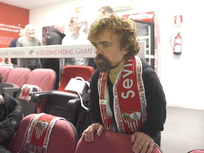 Peter Dinklage, el actor que encarna a Tyron Lannister, con la bufanda del Sevilla FC en el palco del Ramón Sánchez Pizjuán. / SEVILLA FC