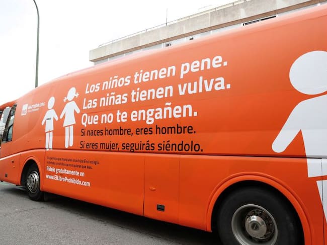 Autobús de la plataforma HazteOír.org que recorre varias ciudades de España con lemas rotulados como "Los niños tienen pene", "Las niñas tienen vulva", "Que no te engañen", "Si naces hombre, eres hombre" o "Si eres mujer, seguirás siéndolo". / EFE