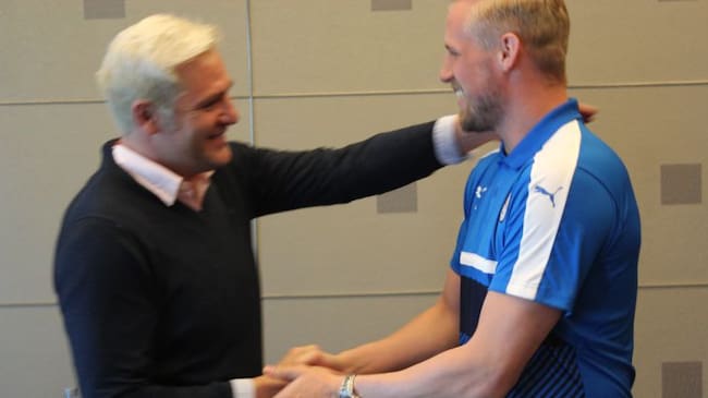 Kasper Schmeichel saluda a Santi Cañizares antes de la entrevista / ALEJANDRO RODRÍGUEZ