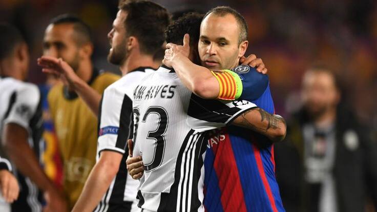 Dani Alves abraza a Andrés Iniesta al término del Barcelona - Juventus. / Shaun Botterill