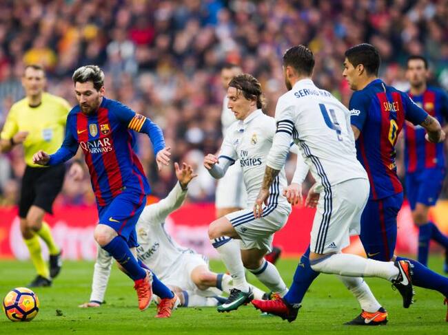 Messi guía el balón en un Clásico / GETTY