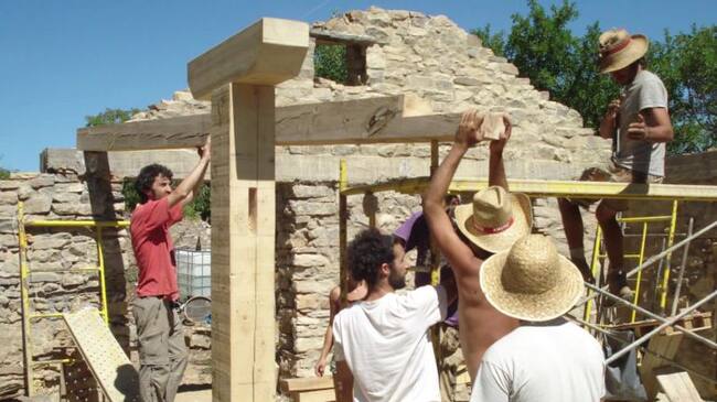 Los jóvenes del Colectivo Fraguas en plena reconstrucción de una de las casas. / Colectivo Fraguas