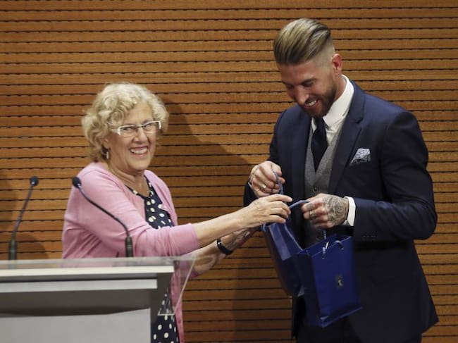 La alcaldesa de Madrid, Manuela Carmena y el jugador del Real Madrid, Sergio Ramos, durante la visita del equipo blanco a la sede del Ayuntamiento del Madrid para celebrar el titulo de Liga de Campeones. / Fernando Alvarado (EFE)