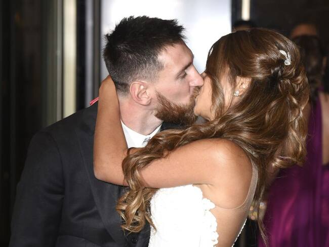 Lionel Messi and Antonela Roccuzzo greet the press after their civil wedding ceremony at the City Center Rosario Hotel & Casino on June 30, 2017 in Rosario, Argentina. / Fotonoticias MDB (WireImage)