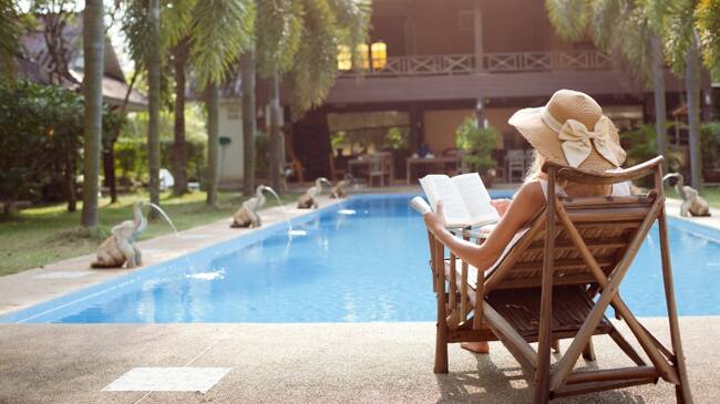 Imagen de una mujer leyendo en una tumbona frente a la piscina de una mansión. / iStock Photo
