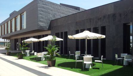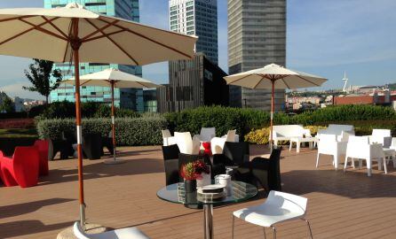 En Madrid: Hotel Santos Maydrit 4*. Una moderna terraza ajardinada cuyos colores contrastan con el azul de su piscina. Así es este oasis que se extiende en un hotel cuya arquitectura con forma de barco sorprende a cualquier visitante. Ubicado entre el Aeropuerto Adolfo Suárez-Madrid Barajas y la dinámica zona de IFEMA, el espacio al aire libre de Maydrit se divide en dos áreas. La primera se localiza junto a la piscina y está dotada de cómodos sofás con colores claros y ambiente totalmente desenfadado, donde se sirven combinados y cócteles de todo tipo. La otra está más enfocada hacia la restauración. Este año como novedad, coincidiendo con el Mundial, todos los días que juegue España, se podrán ver los partidos en su terraza en una pantalla gigante con todos los empleados vestidos con los colores de la roja.