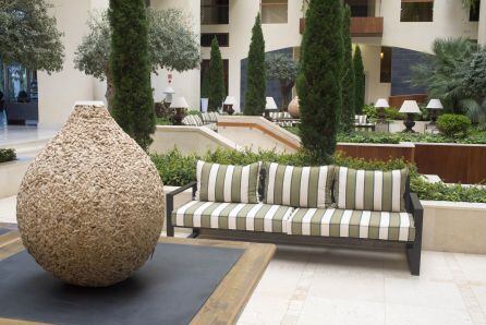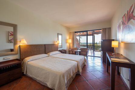 El complejo de 400 habitaciones, diseñado al estilo colonial andaluz, evoca unos parajes situados al otro lado del Atlántico. Un interior donde el verde de la vegetación que decora sus pasillos y la abundante flora que puebla sus jardines transmite la ansiada tranquilidad vacacional.