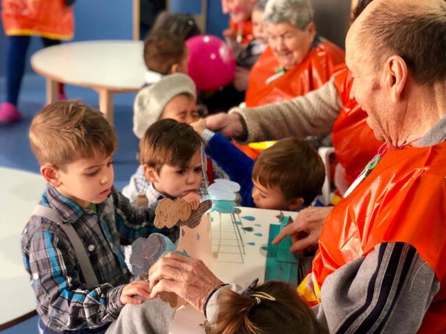 Cada día hacen juntos musicoterapia, pintura, cálculos simples, bailan, se cuentan cuentos… Y el beneficio es mutuo. Porque no sólo los mayores transmiten conocimientos a los niños. Los abuelos aprenden mucho también, y se demuestra así que la educación no es únicamente conocimientos, es también sentimientos, emociones, creatividad. Un espacio de vida.