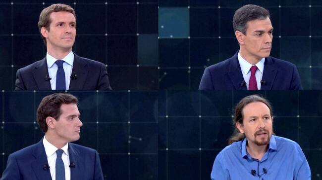 Candidates for Spanish general elections People's Party (PP) Pablo Casado, Spanish Prime Minister and Socialist Workers' Party (PSOE) Pedro Sanchez, Ciudadanos' Albert Rivera and Unidas Podemos' Pablo Iglesias attend a televised debate ahead of general elections in Pozuelo de Alarcon, outside Madrid, Spain, April 22, 2019. TVE via REUTERS ? ?? / REUTERS TV (Reuters)