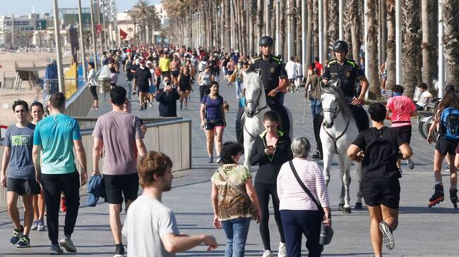 Dos policías a caballo patrullan entre los ciudadanos que pasean por Paseo Marítimo de Barcelona. / Quique García (EFE)