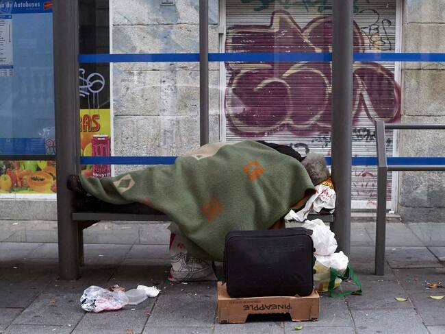 Una persona duerme en una marquesina de autobús en Madrid / Getty Images