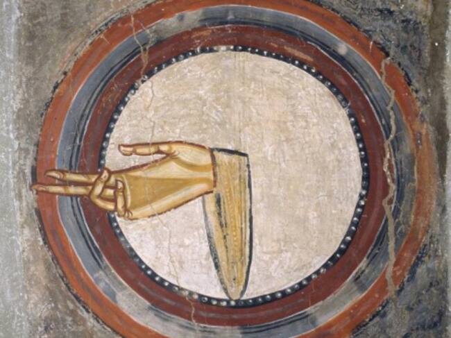 De la cabeza de Cristo con la aureola blanca a la mano de Dios que está justo encima de Él, una de las imágenes más potentes de la Historia del arte: un simple círculo blanco en cuyo centro hay “una mano que habla”, la mano de Dios (Dextera Domini).