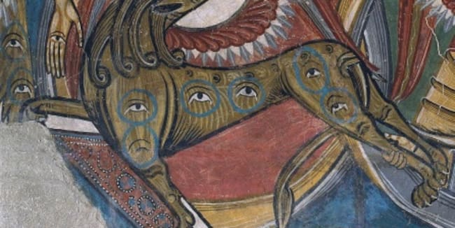 Eso sí, siguiendo la visión del Apocalipsis de Juan, las alas están llenas de ojos (y el cuerpo del toro y el león también)