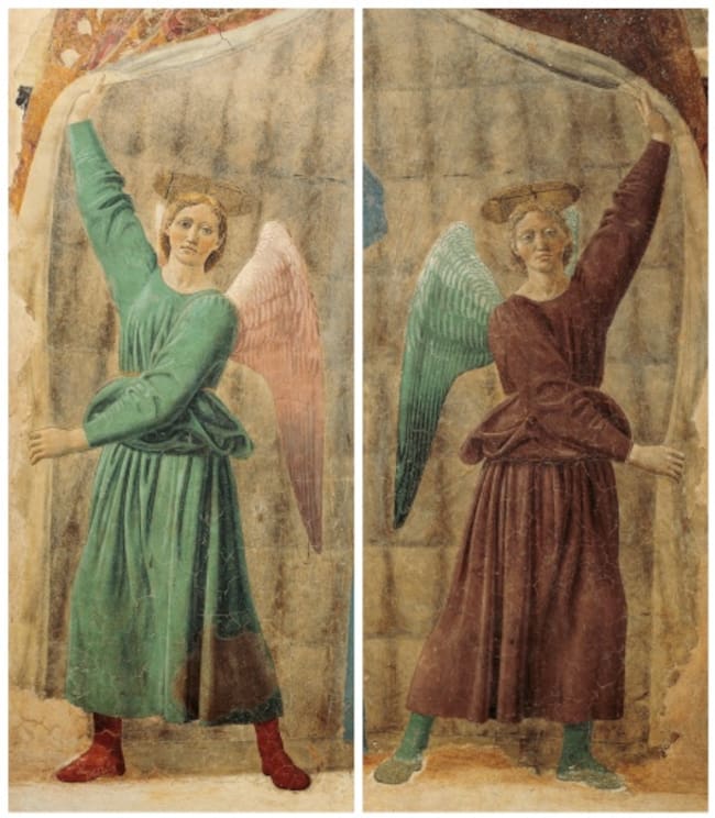 Son simétricos, literalmente: Piero utilizó el mismo dibujo/boceto para traspasarlos al fresco girando el papel. Son el mismo dibujo invertido. Jugando con esta simetría, además, los pintó de verde y rojo, dos colores complementarias, intercambiándolos de uno al otro:
