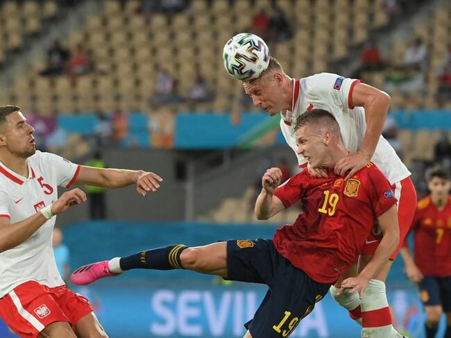 Dani Olmo pelea un balón por alto con la defensa de Polonia / Getty Images