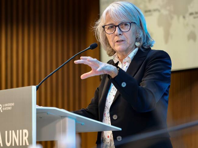 LOGROÑO (LA RIOJA) 08/06/2023.- La presidenta de la Agencia EFE, Gabriela Cañas, interviene en el Aula de la Universidad Internacional de La Rioja (UNIR) sobre los retos y el papel de las agencias de noticias, este jueves en Logroño. EFE/Raquel Manzanares / Raquel Manzanares (EFE)
