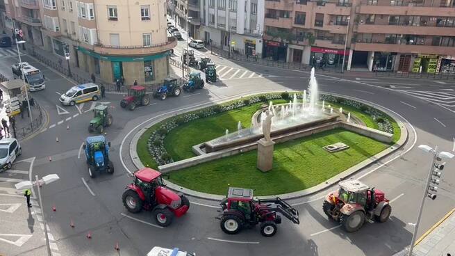 A las dos de la tarde una gran columna de tractores han vuelto a manifestarse en el centro de Logroño. Han paralizado la circulación de Muro de la Mata y han parado sus vehículos en esta zona céntrica. Una gran fila de tractores toma la calle Vara de Rey.