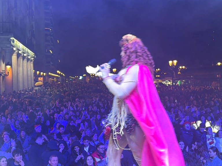 Una gran pantalla ha enfocado el reloj del Espolón justo cuando sonaban las doce campanadas, en un acto presentado por Bárbara la Reina de la Pantaloneta.