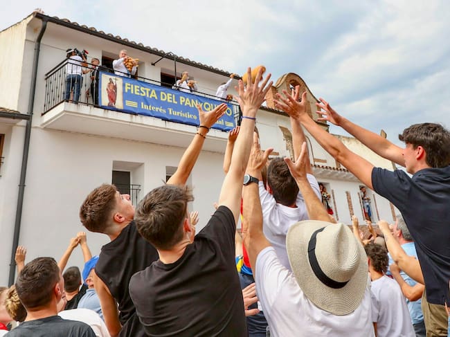 QUEL (LA RIOJA), 06/08/2025.- Unas 2.000 personas se han congregado este miércoles frente a la ermita de la Santa Cruz de Quel para conseguir los 2.500 bollos de pan y 60 kilos de queso de Roncal troceado en porciones que les han lanzado para revivir, como cada 6 de agosto, una tradición que data de 1479. EFE/ Raquel Manzanares / -