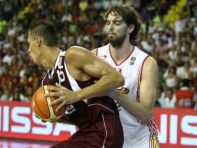 Letonia dispone de un hombre de parecidas características, Andris Biedrins, y ambos sacaron a relucir la clase de su juego en algunos cara a cara que sólo están al alcance de los mejores. El letón se mostró letal cerca del aro, igual que Pau, que con dieciséis puntos en la primera parte hizo posible que la selección española dominará en el marcador al alcanzar el descanso (41-36).