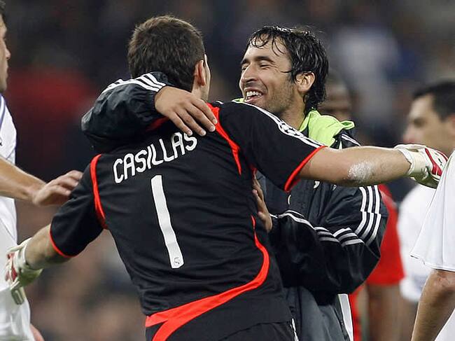 Casillas es felicirado por Raúl a la finalización del encuentro,