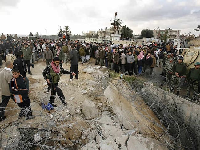 Los enmascarados han hecho estallar unos 17 artefactos explosivos que han acabado con las dos terceras partes del muro que separa la franja de Gaza de Egipto. Además, los milicianos han derribado una empalizada de cemento armado con excavadoras y han abierto quince boquetes en la barrera sin que los gendarmes egipcios trataran de impedirlo ante las escenas de caos.