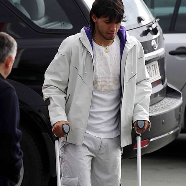 El Kun Agüero, en muletas, tras el pisotón de un jugador del Murcia que le causó un fuerte esguince de tobillo el pasado domingo(Reuters)