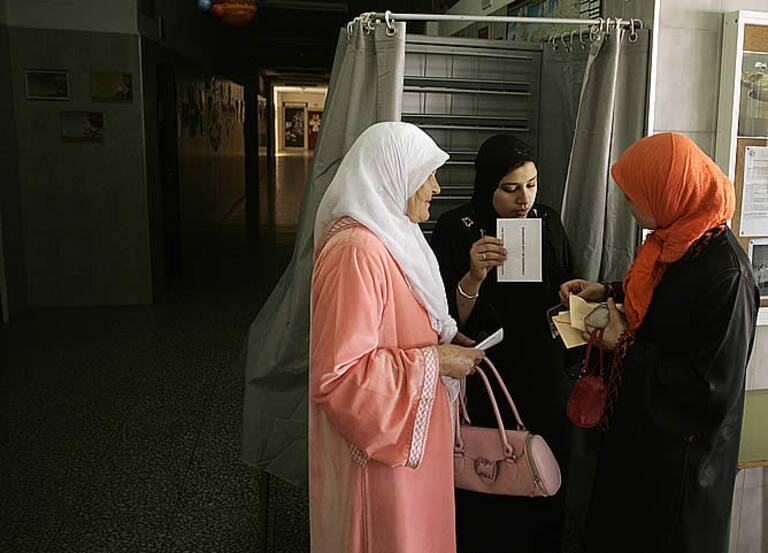 Tres mujeres musulmanas preparan su papeleta para votar en Ceuta