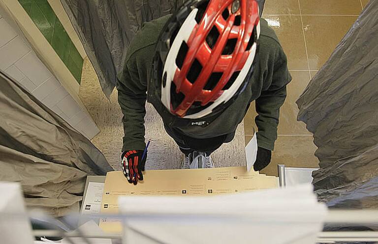 Un ciclista en Burgos recoge su papeleta para ejercer su derecho a voto