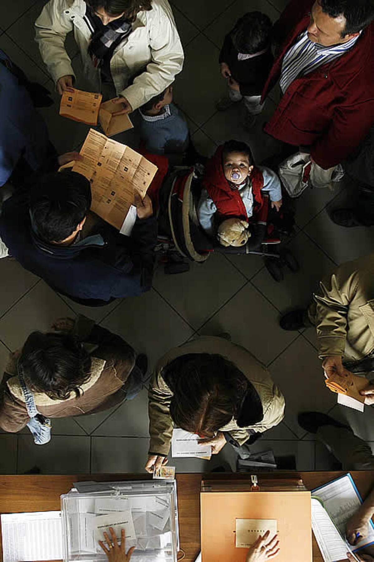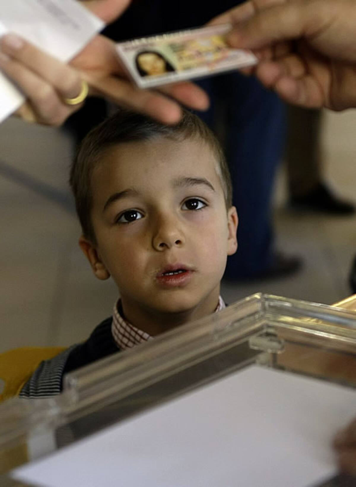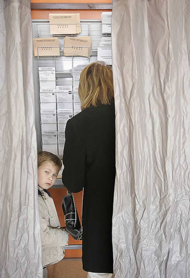 Un niño espera a su madre mientras ésta recoge su papeleta