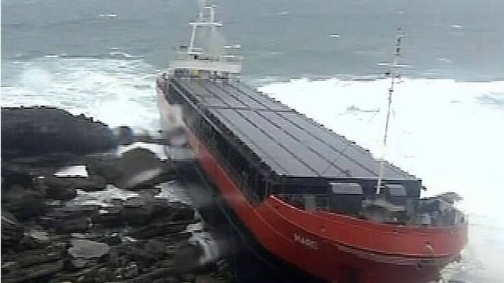 El fuerte oleaje rompe en tres partes el buque <i>Maro</i>, encallado cerca del puerto guipuzcoano de Pasajes, y hunde más de 50 embarcaciones en el puerto deportivo de Donostia