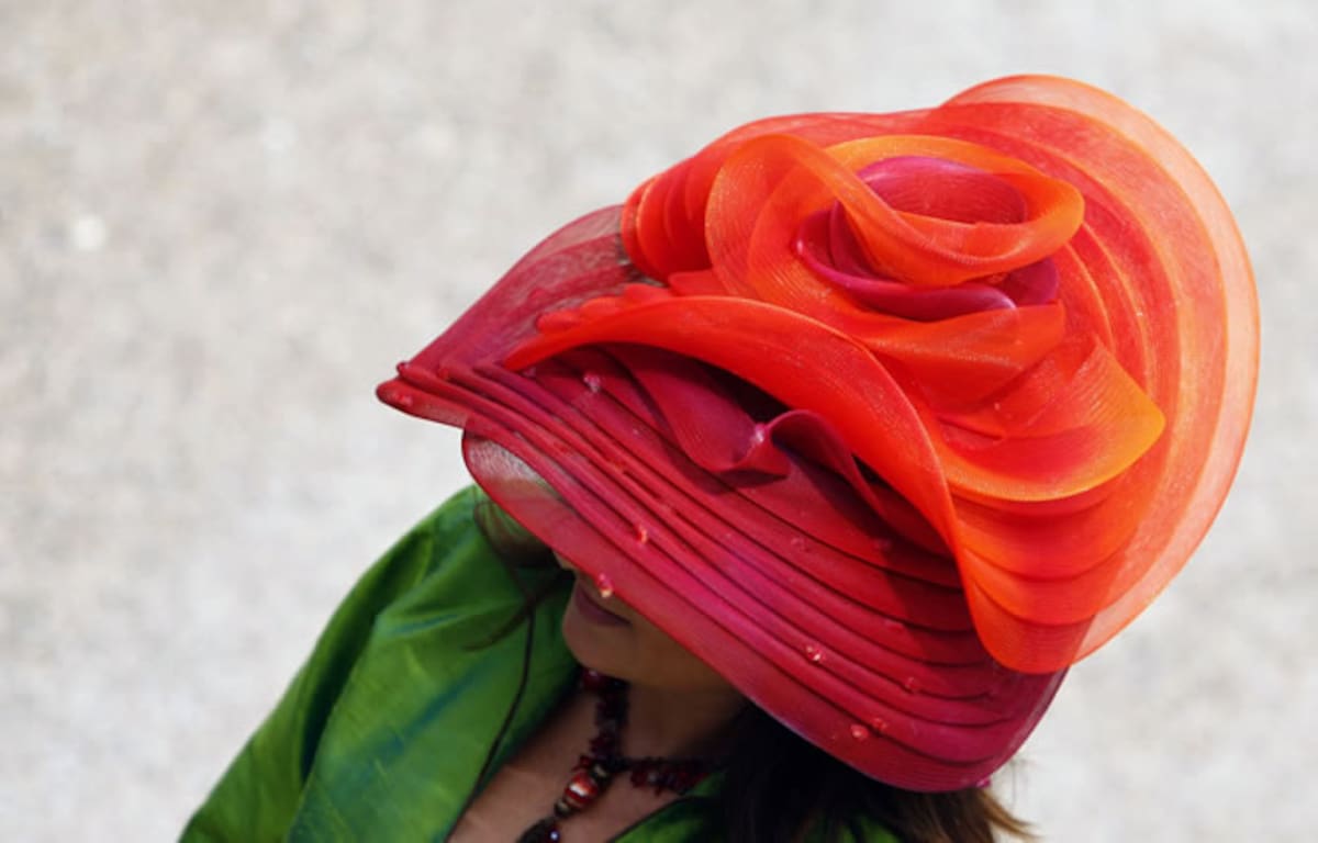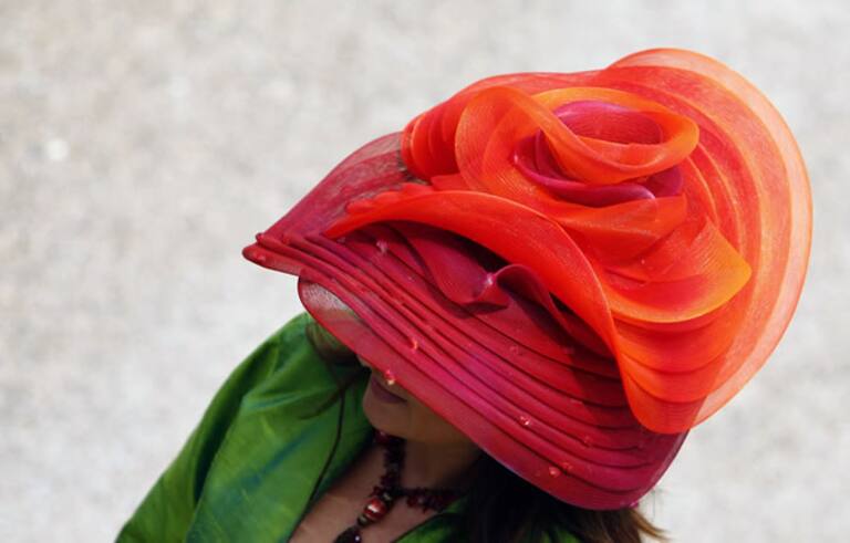 Como cada año, la alta sociedad británica se da cita en las carreras de caballos de Ascot, que marcan el inicio del verano social. Allí compiten los sombreros más orginales. Como éste, en tonos rojos y naranjas.