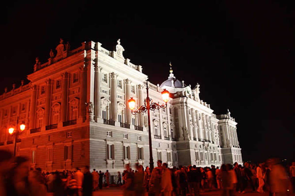 La luz roja ilumina uno de los laterales del Palacio Real