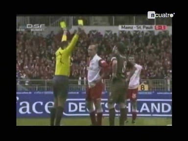 Un árbitro de la Liga alemana enseña dos tarjetas amarillas al mismo tiempo