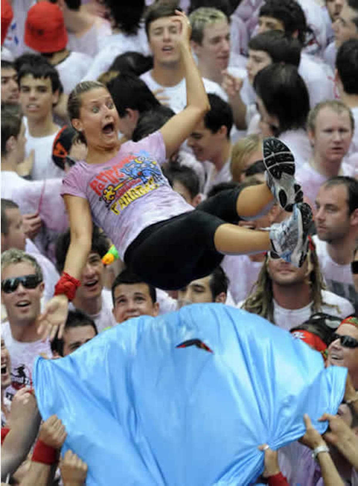 Una mujer es elevada en el aire como parte de los festejos de San Fermín, que durarán nueve días en la cuidad de Pamplona