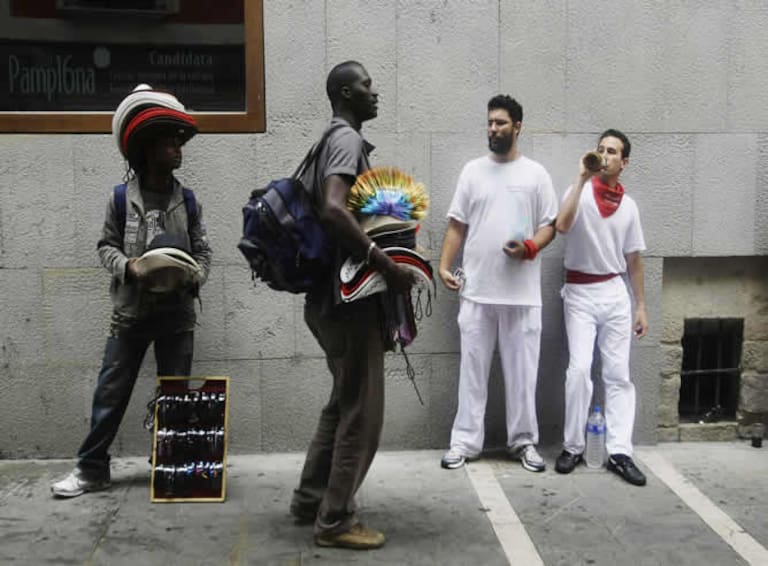 Los vendedores ambulantes se acercan a los miles de turistas para vender camisas blancas y bufandas rojas típicas de estas fechas