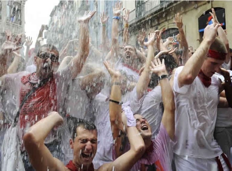 Los juerguistas se empapan con agua al comienzo del festival San Fermín 2009, que inició este lunes con el tradicional "Chupinazo"