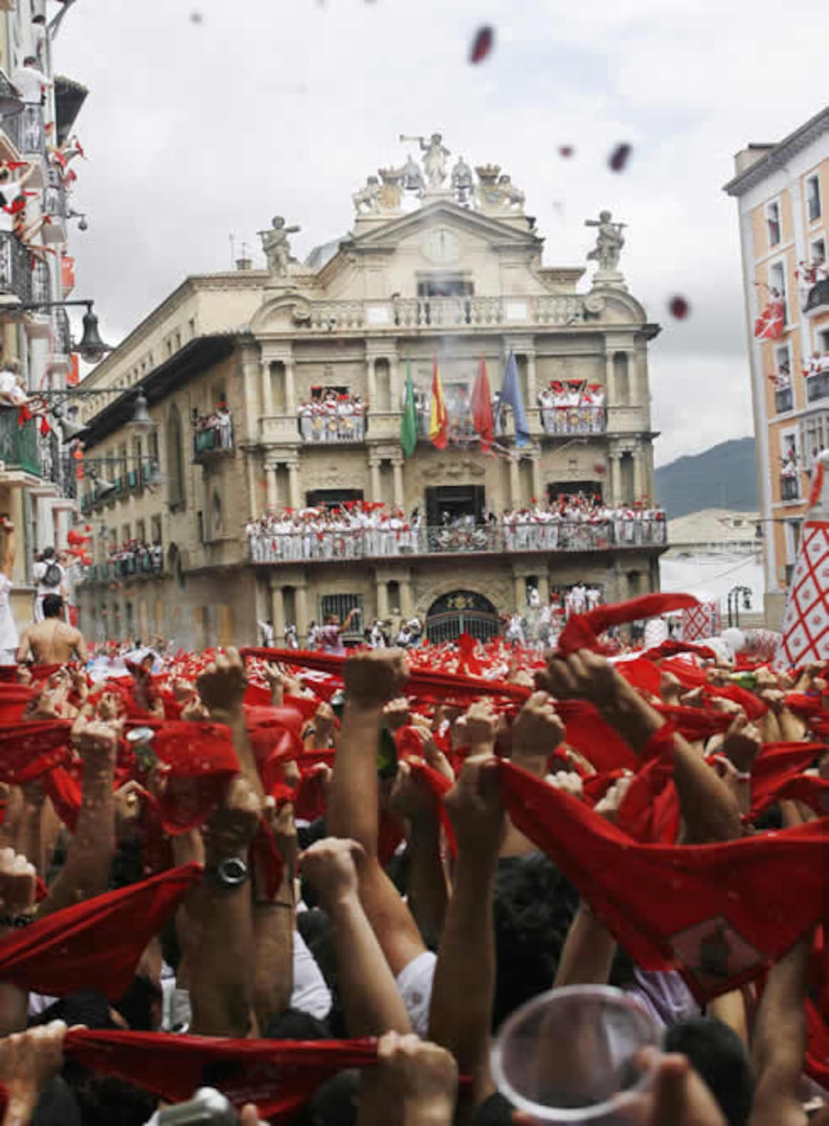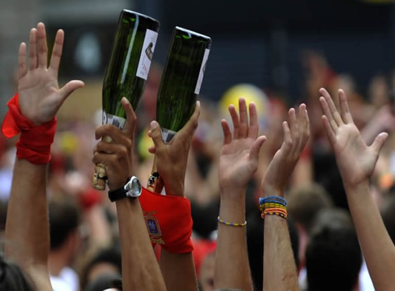 Los asistentes levantan botellas mientras observan el lanzamiento del 'Chupinazo', que marca el inicio oficial de los festejos